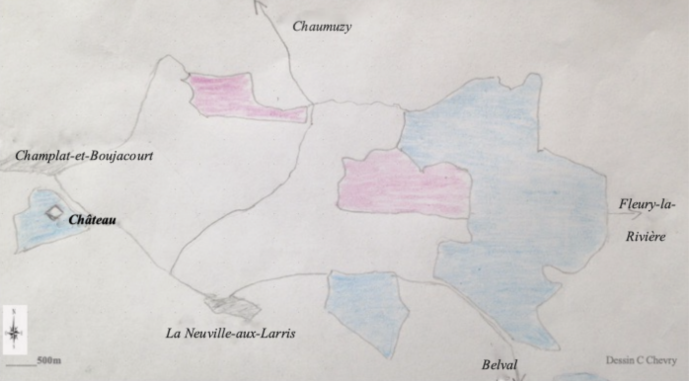 Les bois des Didier de Champlat victimes de dommages de guerre se répartissent sur les finages de Champlat, La Neuville-aux-Larris, Belval-sous-Châtillon et Chaumuzy. En 1894, les cousins Didier de La Neuville-aux-Larris avaient mis en vente une quinzaine de pièces de bois, dont cinq grandes regroupant 188 ha pour 208 000 francs, côtoyant les bois de Lucien (dont 239 ha loués pour la chasse), d’Hortense et d’Alice Didier.