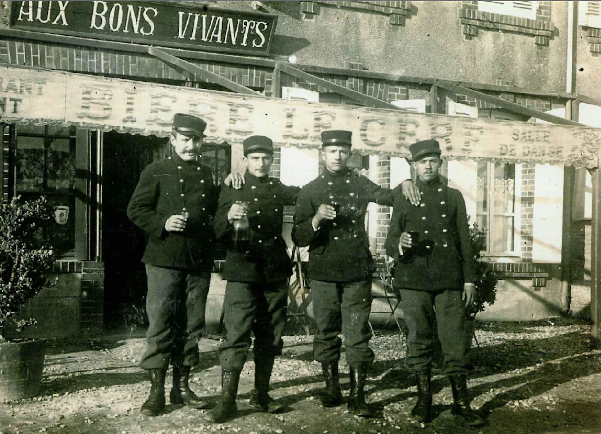 Julien Chevry, marsouin, est mort le 11 juin 1915 à La Harazée, près de Vienne-le-Château. Il figure à gauche sur ce cliché qui a été envoyé le 18 novembre 1914 de Cherbourg, devant le café Aux bons vivants (Quelle ironie du sort ! Ces quatre compagnons d’armes sont tous morts pour la France quelque temps après !). Julien a été incorporé dans la 1re Coloniale, 26 e Compagnie, vaguemestre. Ses parents, Cyrille Chevry et Georgina Nolin, n’ont pas demandé la restitution de son corps, estimant qu’il devait rester enterré parmi ses camarades et que l’Etat entretiendrait bien sa tombe. De mémoire de famille, il semblerait qu’ ils ne soient pas allés se recueillir au cimetière de La Harazée, malgré le voyage annuel gratuit offert par l’Etat (il est vrai que les frais d’hôtel n’étaient pas inclus). C’est leur petit fils, bien des années après leur décès, qui ira faire découvrir à ses enfants la sépulture de Julien.