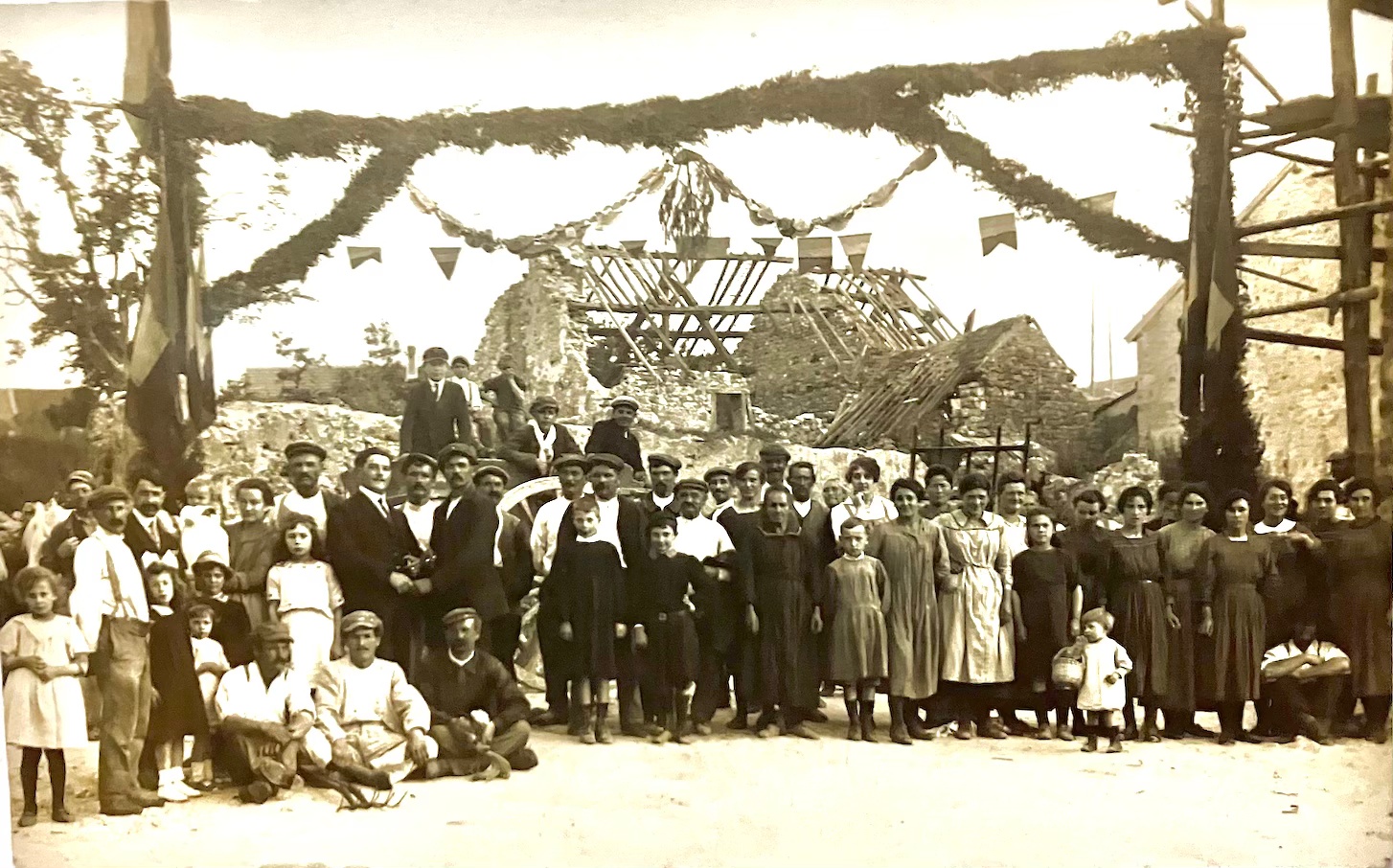 Habitants de Cuchery rassemblés sur la place en ruine le jour de l’inauguration du monument aux morts. © CPA . . . . Beaucoup de femmes, d’enfants et même quelques maçons de la reconstruction ont posé devant le photographe.
