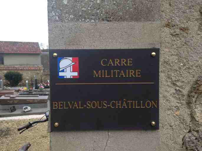 Le carré militaire de Belval-sous-Châtillon, entretenu aux frais de l’Etat, compte vingt tombes de combattants morts pour la France représentatifs du grand brassage de population observé dans l’armée entre 1914 et 1918. Deux, appartenant à la cavalerie, sont originaires du Loiret dont un issu d’une famille de la noblesse : Paul Raguenet de Saint-Albin. Les 18 autres, fantassins, pour la plupart originaires des quatre coins de la France, sont tombés essentiellement en juin 1918, à Belval ou à proximité. Six d’entre eux appartenaient à des bataillons de tirailleurs sénégalais, parmi lesquels quatre venaient d’Afrique noire française. La mort de ces combattants est due soit à des tirs de harcèlement de l’artillerie allemande, soit à un accident ou encore à une maladie. Le carré militaire de Belval est en réalité une rangée respectant la scénographie égalitaire imposée dans les nécropoles nationales. Le nom des soldats inhumés est inscrit sur chaque croix ou stèle (pour ceux qui ne sont pas chrétiens). Aucune famille du village ne les a connus, mais ce carré militaire est bien mieux entretenu que certaines pierres tombales à proximité qui ont l’air d’être oubliées depuis longtemps.