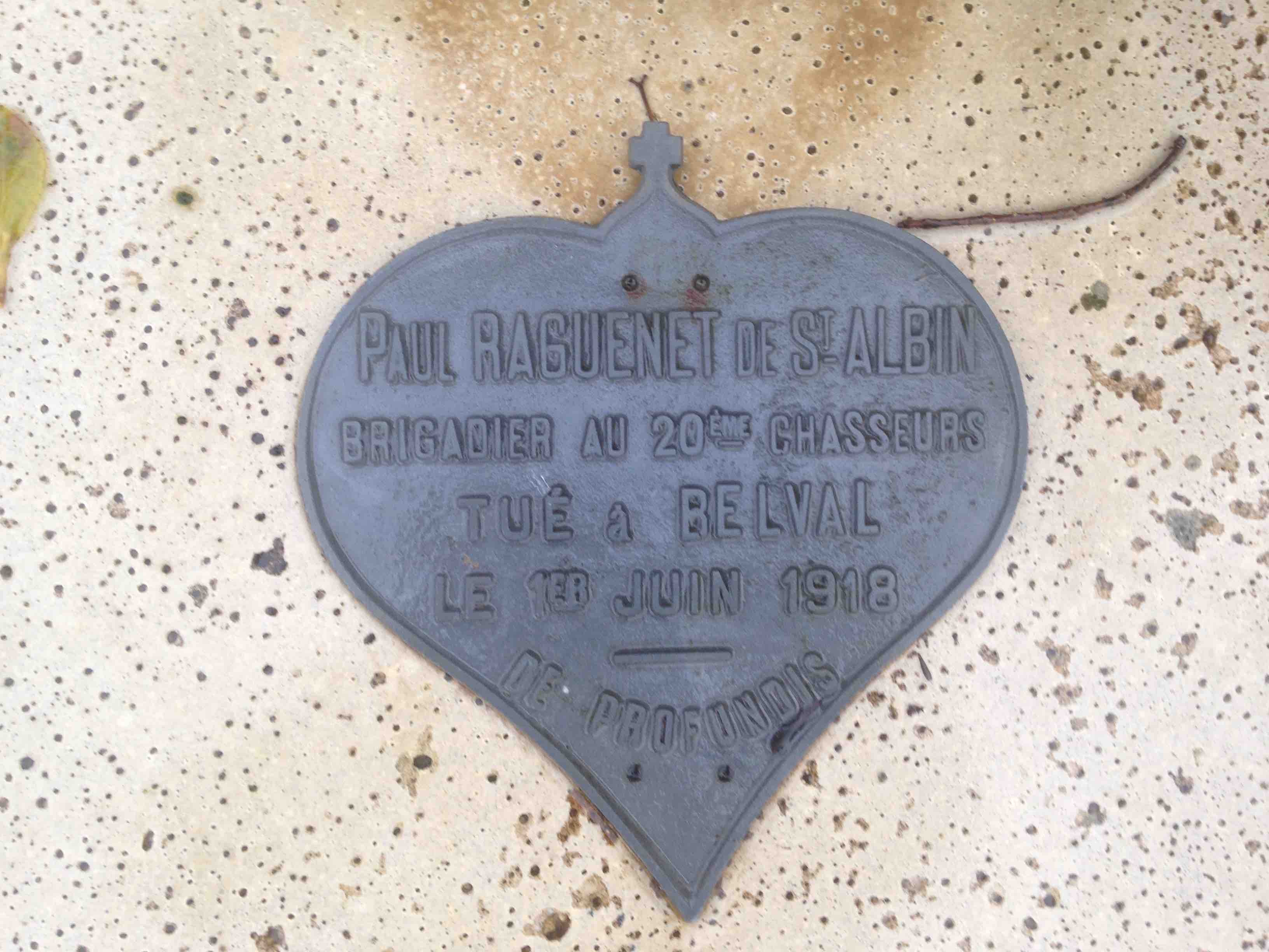 Sur certaines tombes, un article funéraire a été déposé, tel celui au pied de la tombe de Paul Raguenet de Saint -Albin. A l’instar de nombreux militaires issus de la noblesse, il a servi dans la cavalerie. Tué le 1er juin 1918 , ayant accompli une périlleuse mission de reconnaissance qu’ il avait lui même sollicitée7. Décoré à titre posthume de la Croix de Guerre 2 étoiles.
