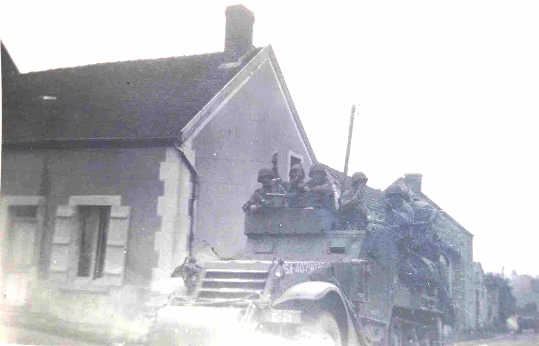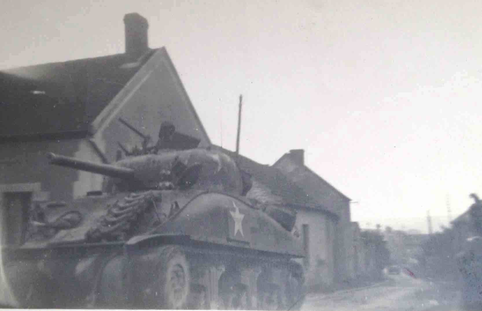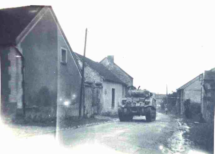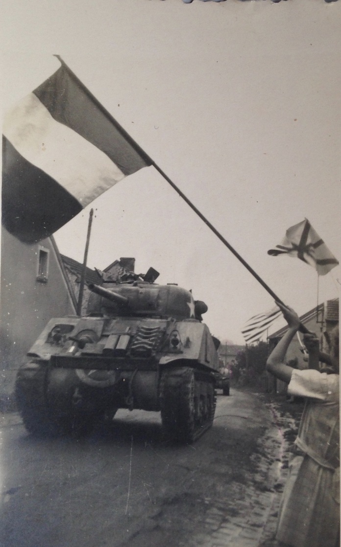 Les troupes du Général Patton libèrent la Marne au cours des derniers jours d’août 1944. Elles ont défilé dans la Grande Rue : chars chenillés faisant trembler le sol à grand bruit et voitures blindées. Arrivés au bas de la place, certains véhicules se sont dirigés vers Orcourt, d’autres vers La Neuville-aux-Larris. La personne que l’on devine, en train de tendre le drapeau tricolore (cliché 2), était une réfugiée francophone, originaire de Moselle, Madeleine Feger, qui habitait avec sa famille rue de la Barbe-aux-Cannes. Avec des draps teints et des accessoires de fortune plusieurs femmes du village avaient confectionné des drapeaux français, britannique, russe et américain (à qui il manquait des étoiles !) . D’après le témoignage de Mme Chevry Mariette, auteure des clichés.
