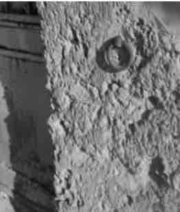 L’enlèvement du crépi découvre le départ de voûte de l’ancienne chambre à four disparue.