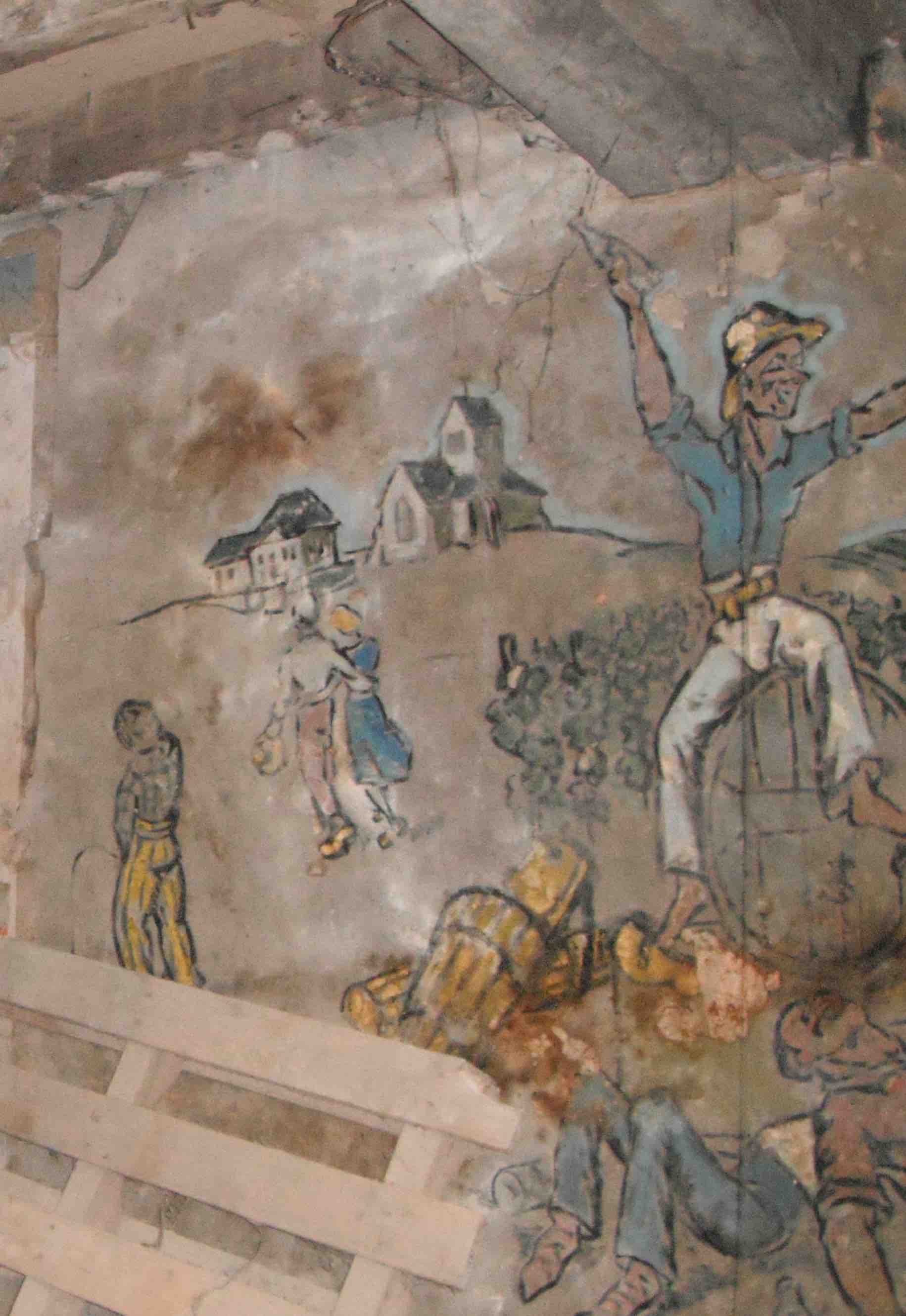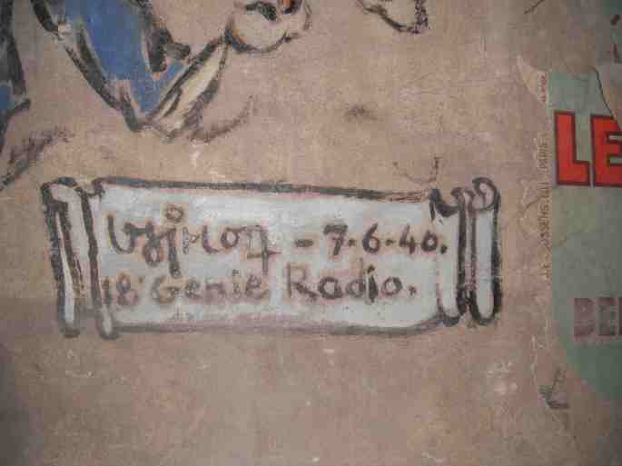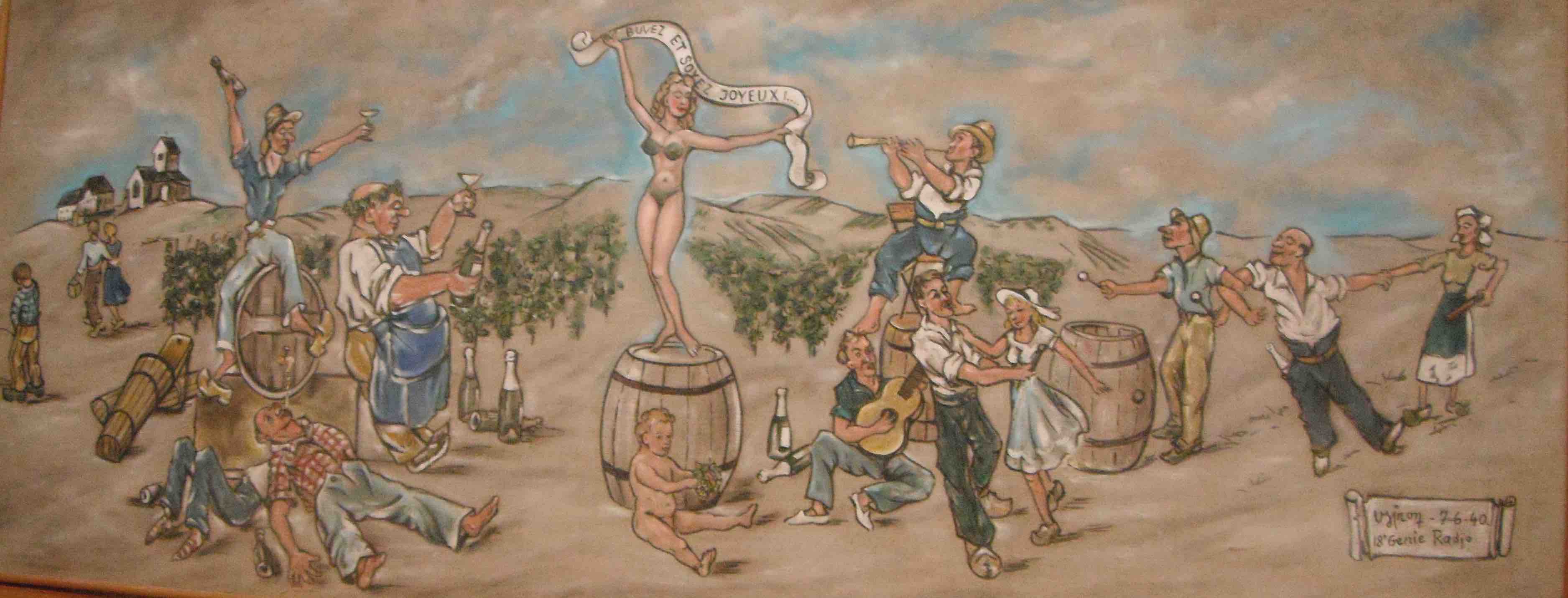 La fresque est datée du 7 juin 1940. A -t-elle été entreprise durant la « drôle de guerre » ou réalisée après le 10 mai ? La scène d’ivresse représentée est bien entendu imaginaire, la population de Cuchery ne peut s’y reconnaître. La signature est celle d’un homme du 18e régiment du Génie, apparemment affecté aux transmissions et présent dans le village. Le 7 juin, l’armée allemande était en train de déferler sur la France. La population de Cuchery a pris le chemin de l’exode deux jours après. Du 10 au 13 juin 1940, des combats se déroulent dans la région. Au sein du territoire cucheriat, nous avons trace d’au moins deux soldats morts lors de ces combats, l’un français et l’autre allemand.