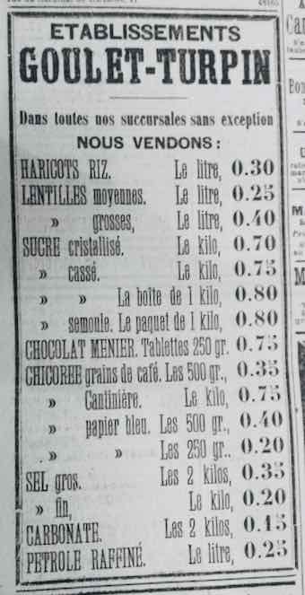Vers 1900-1921 Le n° 5 est devenu l’épicerie de Jules Œslick et de son épouse, Marie Dervin, sœur d’ Eugène Dervin, puis vers 1906, succursale n°33 des Etablissements de la Société Anonyme Goulet-Turpin, à laquelle est venu s’accoler un café. Le couple Œslick-Dervin vend des produits d’épicerie de base, conservés au sec. La population de l’époque n’a guère les moyens d’acheter les produits frais qu’elle ne produit pas sur place : certains fruits ou légumes et poissons de mer. Il n’existe pas beaucoup de traces de marchands ambulants qui en auraient fait la vente au village, tout juste une marchande de harengs en 1912 et le boucher-charcutier Charles François de Châtillon-sur-Marne en 1913. En mars-juin 1919, André Œslick, l’héritier de l’épicerie, encore aux armées, obtient un sursis afin d’essayer de la restaurer. En août-septembre, la boutique n’a d’ailleurs plus rien à vendre aux habitants revenus de l’exode. Un dépôt de denrées alimentaires est constitué à Châtillon-sur-Marne, avec mise à disposition des maires du canton d’un camion pour les faire parvenir jusqu’à leur commune.