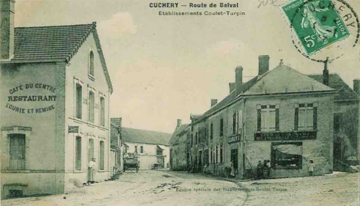 Au premier plan, à gauche : la mairie-école, à droite : l’auberge « Ancien-Liébart » et sa salle de bal qui accueillera les fraternités belges dans les années 1950-1970. En 1906, les archives parlent de réverbères, qui ont l’air d’éclairer les rues du centre de Cuchery et de cette partie de la Grande Rue.