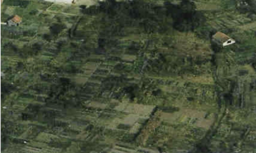Le cliché laisse deviner le parcellaire, et nous montre les deux lavoirs : celui de la Mare Robert, à droite, celui de la Mare Londret, à gauche.